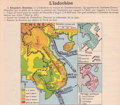 RESUME : L'Indochine est une région montagneuse de l'Asie du Sud-Est, avec deux riches deltas au Nord et au Sud. Le riz, le caoutchouc, le charbon sont les principales ressources du pays. Toute la vie se concentre dans les deltas où se trouvent les villes importantes : Hanoï et Haïphong. seuls le Laos et le Cambodge demeurent dans l'Union Française dont se sont détachés le Nord Viet-nam et le Sud Viet-nam.